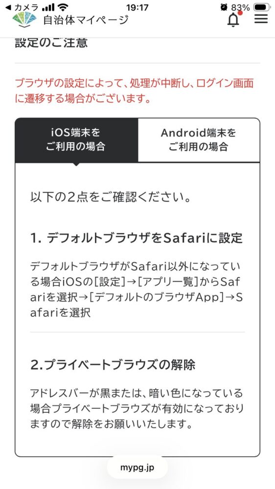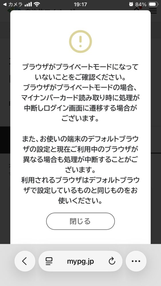 ※プライベートモードの場合、マイナンバーカード読み取り時に処理が中断し、ログイン画面に戻ることがあります。