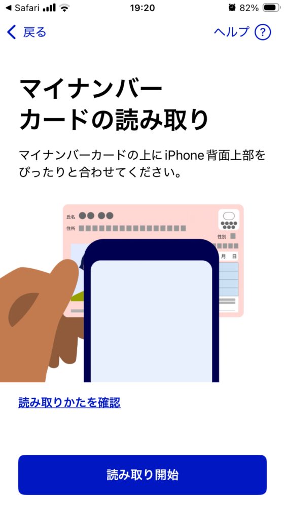 スマホをマイナンバーカードにかざして読み取ります。