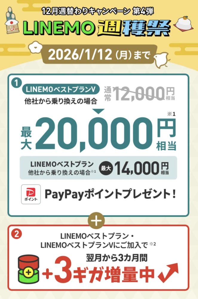 LINEMOに乗り換えるタイミングですが、PayPayポイント増量期間を狙うのがベストです。