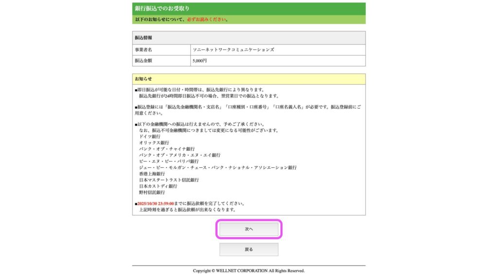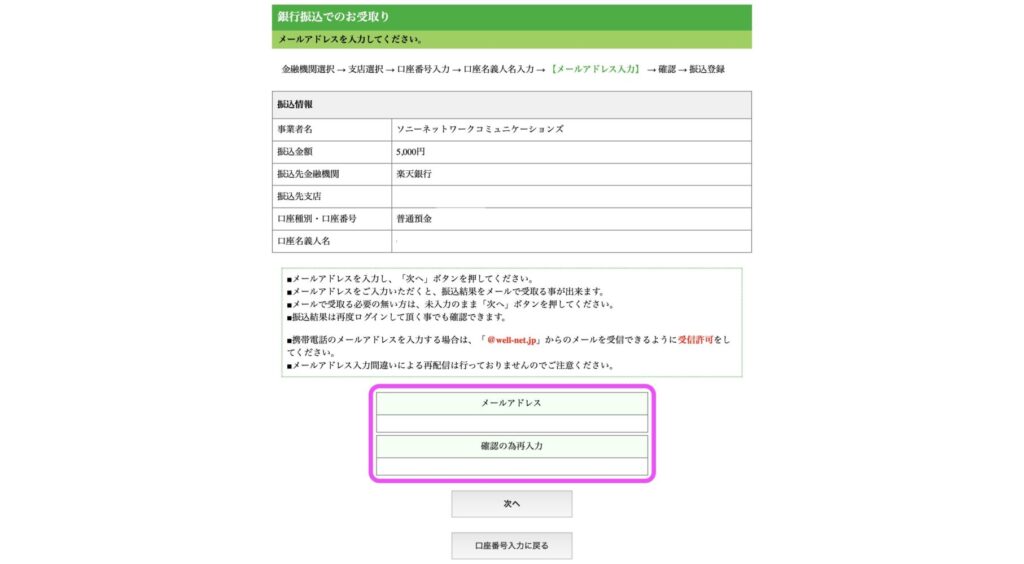 すると、振り込み情報の入力画面に進むので、「次へ」を選択しましょう。