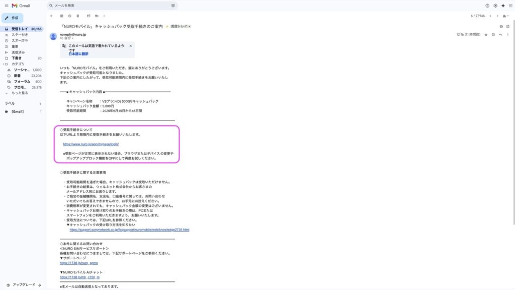 NUROモバイルのキャッシュバックは、メールで通知が来ます。