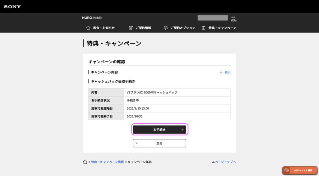 キャンペーンを確認して、「お手続き」を選択しましょう。