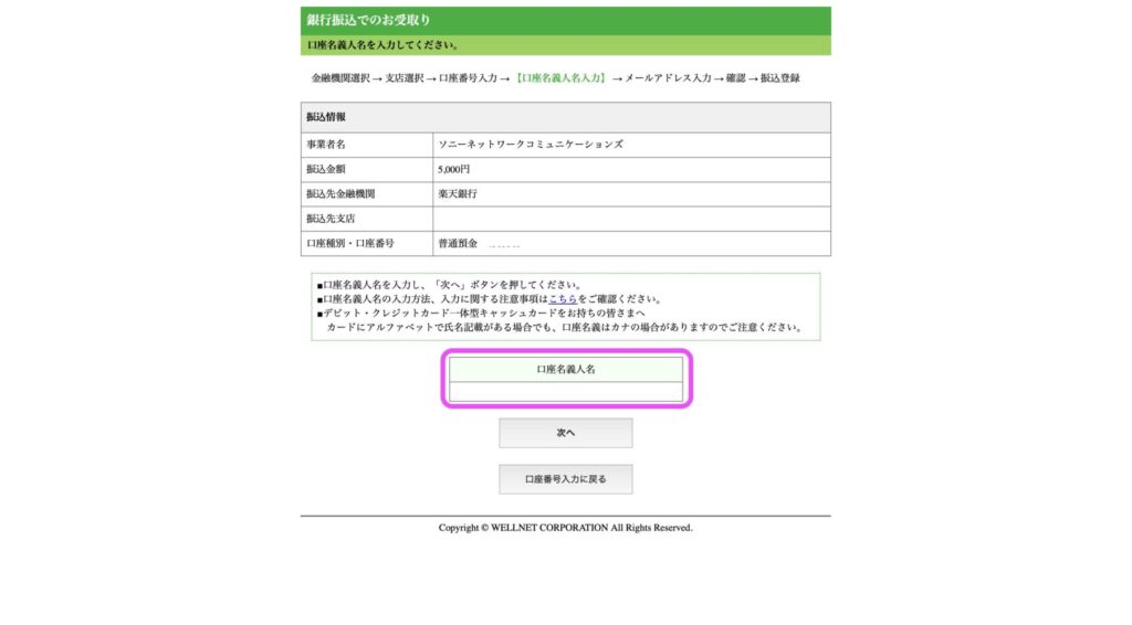 あとは、口座名義人(自分)の名前をカタカナで入力しましょう。
