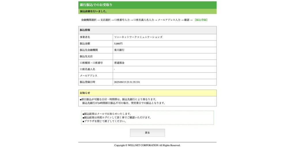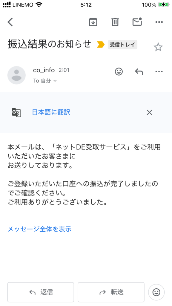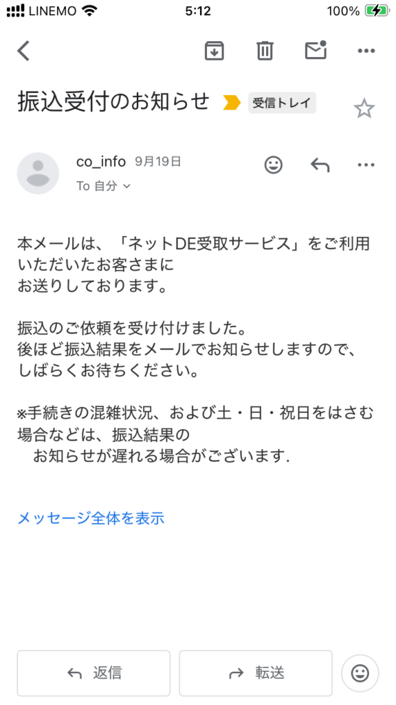 振り込み完了のメールが届きました!