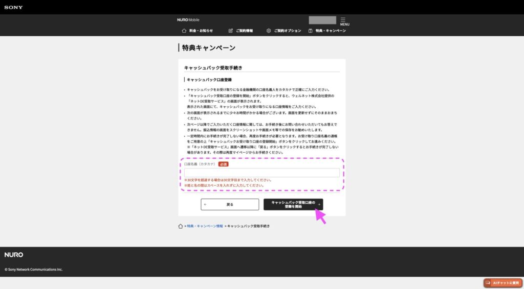 キャッシュバックを受け取るために、口座の登録が必要です。