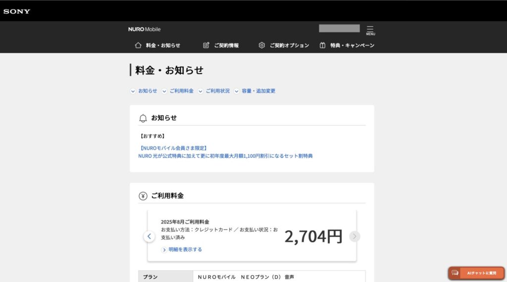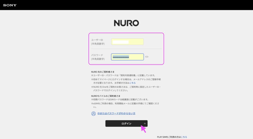 メールに届いたURLから、NUROモバイルのマイページにログインします。