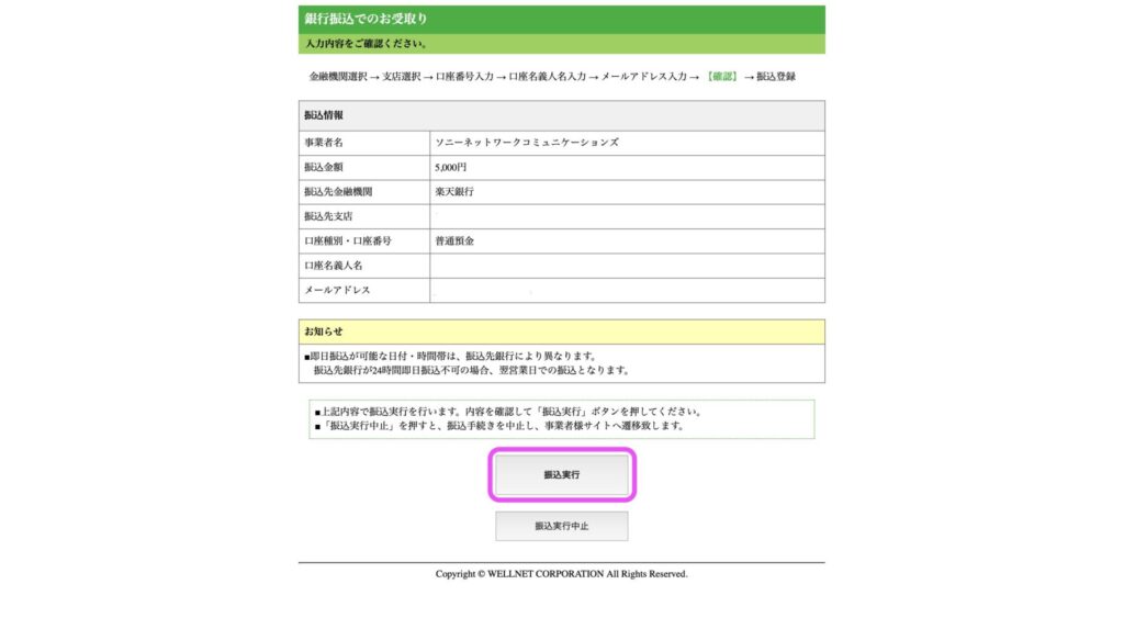 最後に、振込情報を確認して「振込実行」を選択すればOKです!